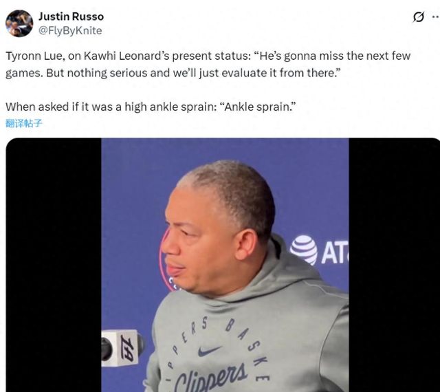 倫納德腳踝扭傷,未來幾場不會出戰,歸期未定。