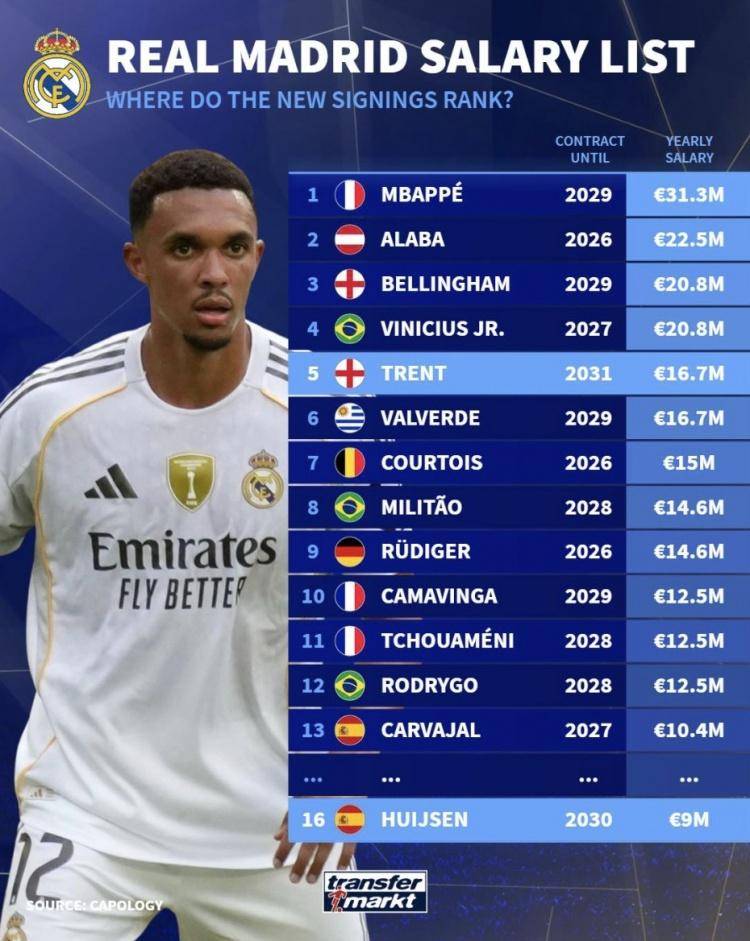 24直播网北京时间7月20日,德国《转会市场》罗列出了一份皇马队内年薪排行,姆巴佩高居第一,贝林厄姆第三,维尼修斯第四,有离队传闻的罗德里戈仅名列第12。